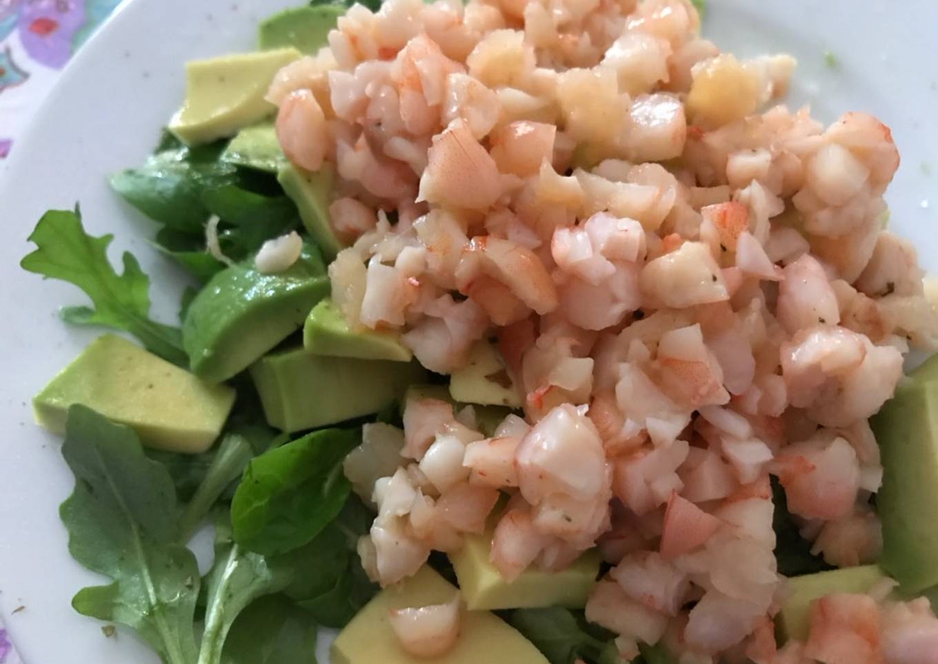 - Cortar el aguacate a trocitos pequeños, echar un chorrito de limón, aceite, sal y pimienta (cebolla en polvo opcional). Mezclar bien y colocar en un plato. Encima del aguacate poner los langostinos y servir.
