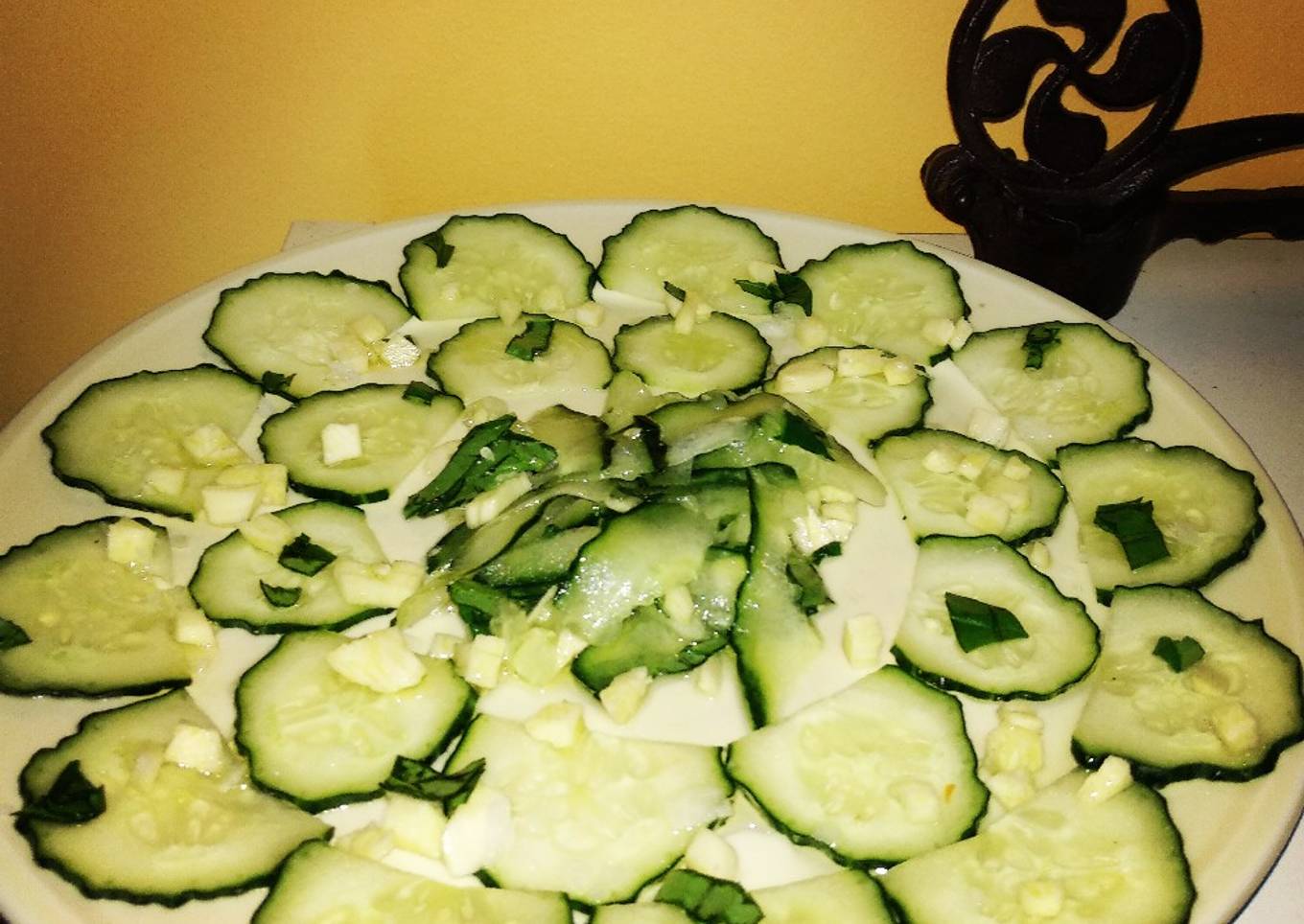 - Cortamos medio pepino en tiras y ponemos a macerar mínimo 15 minutos, con un ajito, unas hojitas picadas de albahaca, vinagre, Aove y sal