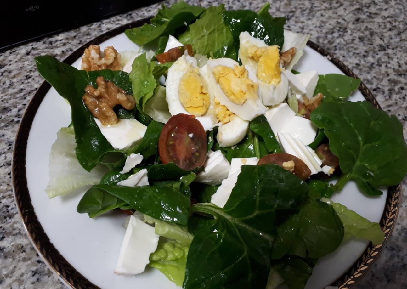 - En un bol ponemos lo del escurridor, añadimos, el queso cortado en trozos, las nueces y el huevo cuando esté listo. Añadimos aceite de oliva y sal al gusto y listo.