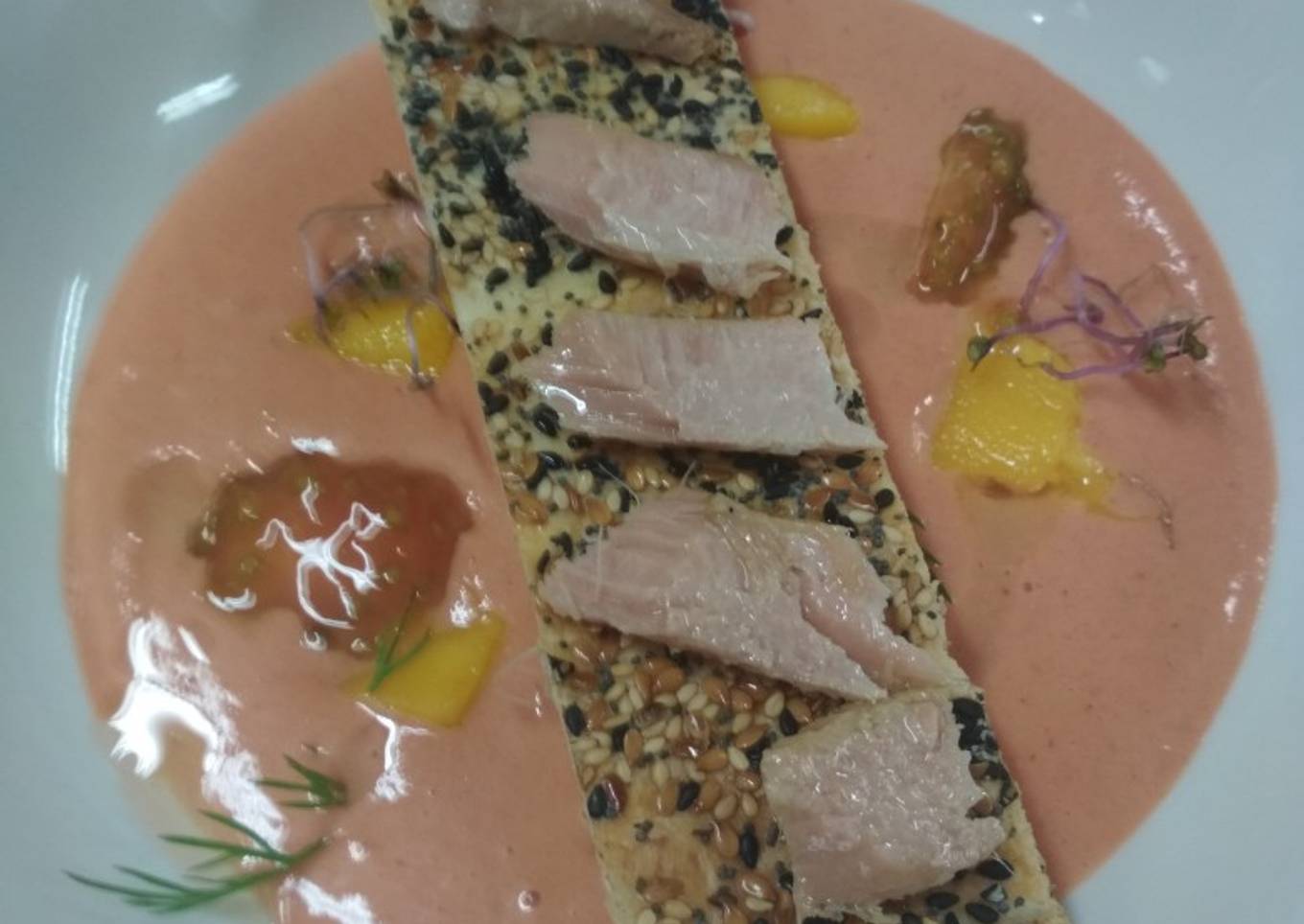 - Emplatado: En un bol o plato hondo colocamos un fondo de salmorejo, decoramos con trocitos de mango y algunos germinados. Colocamos el crujiente apoyado en el borde con la ventresca en trocitos por encima. Adornamos con unas gotas de AOVE.