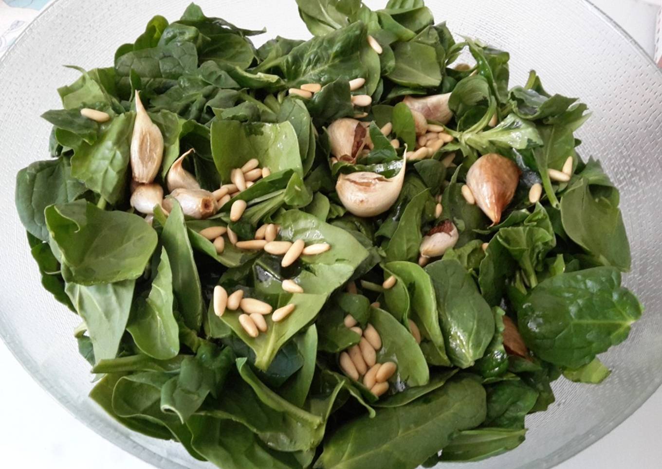 Ensalada de espinaca y canónigos con ajo y piñones