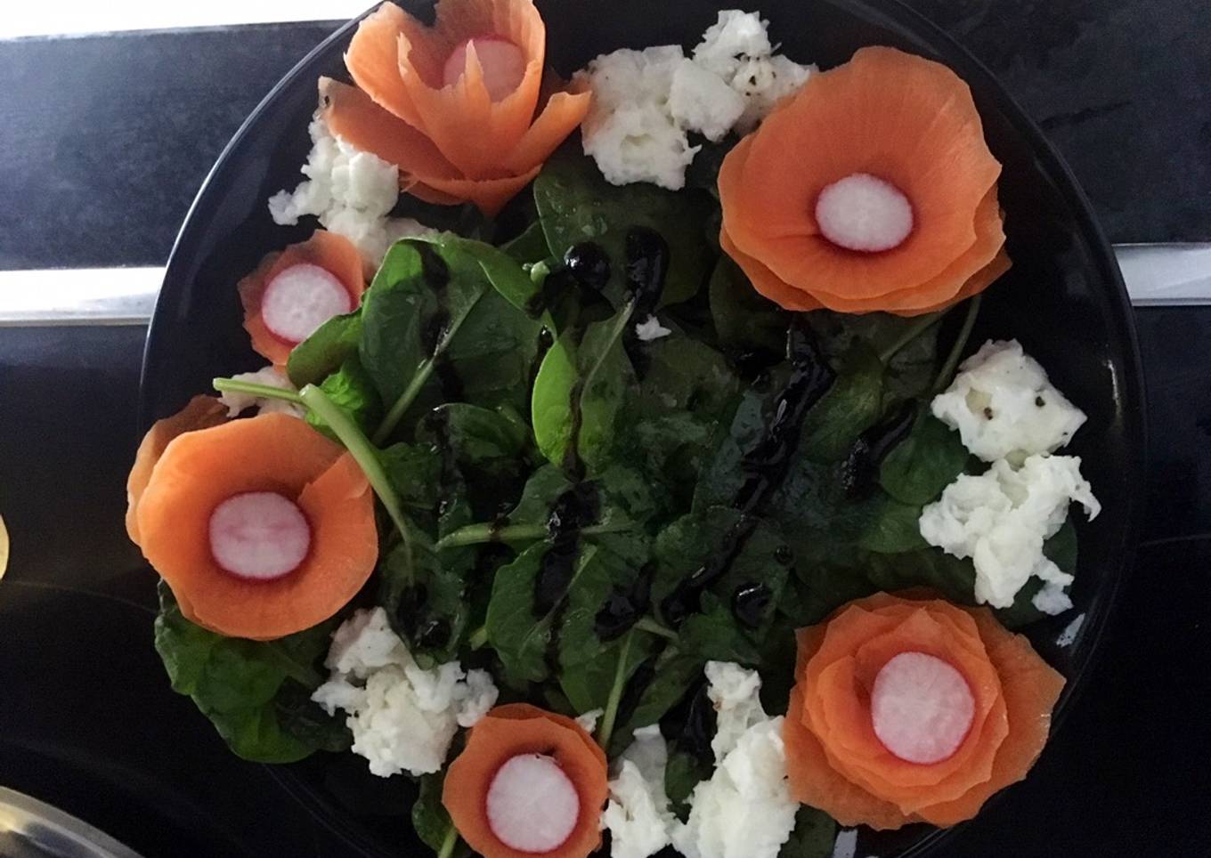 - Colocamos las flores de zanahoria y rabanito y lo intercalamos con trocitos de tortilla de claras.
