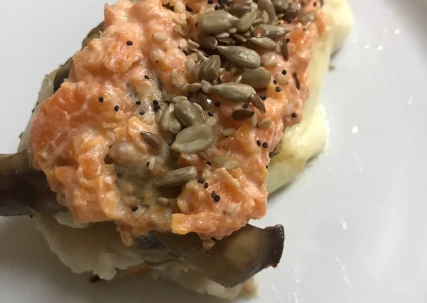 - Montaremos al sacar de la plancha los champiñones sobre la merluza y colocaremos el queso encima para que funda con el calor. Finalmente, añadiremos la salsa de zanahoria encima.
