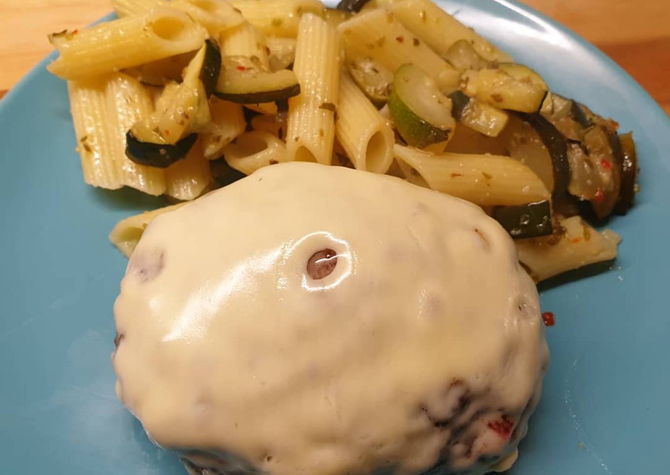 Hamburguesa con pasta y calabacín