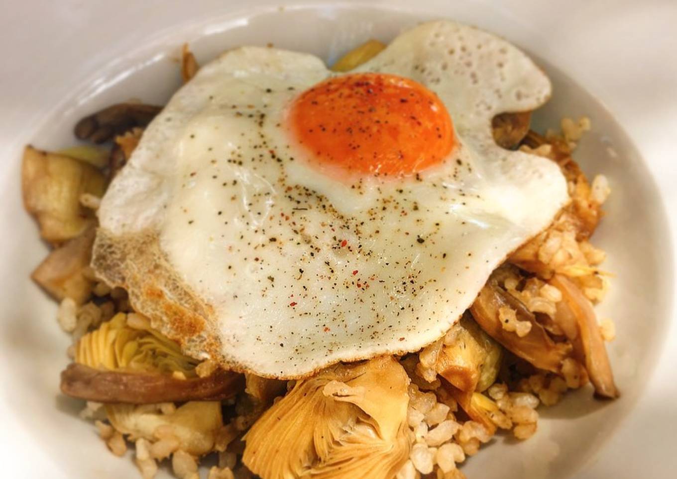 Arroz integral con alcachofas y huevo a la plancha