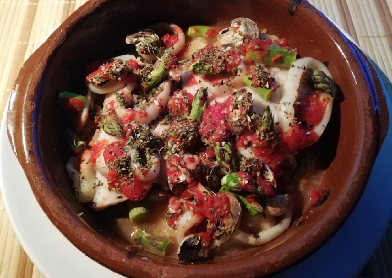 - Añadimos la merluza, los calamares y el resto de los vegetales, exprimimos otro chorrito de limón y añadimos el tomate natural triturado, el orégano y una pizca de sal.