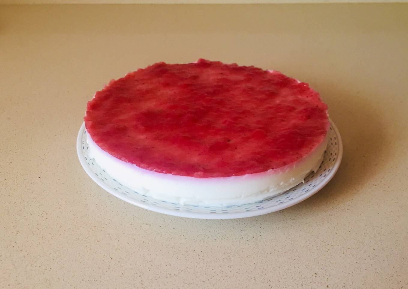 - Dejamos reposar la base de la tarta y el queso hasta que se enfríe y después lo metemos a la nevera durante 5 horas. Ahora le ponemos por encima la mermelada de fresa y ya estará listo para comer.