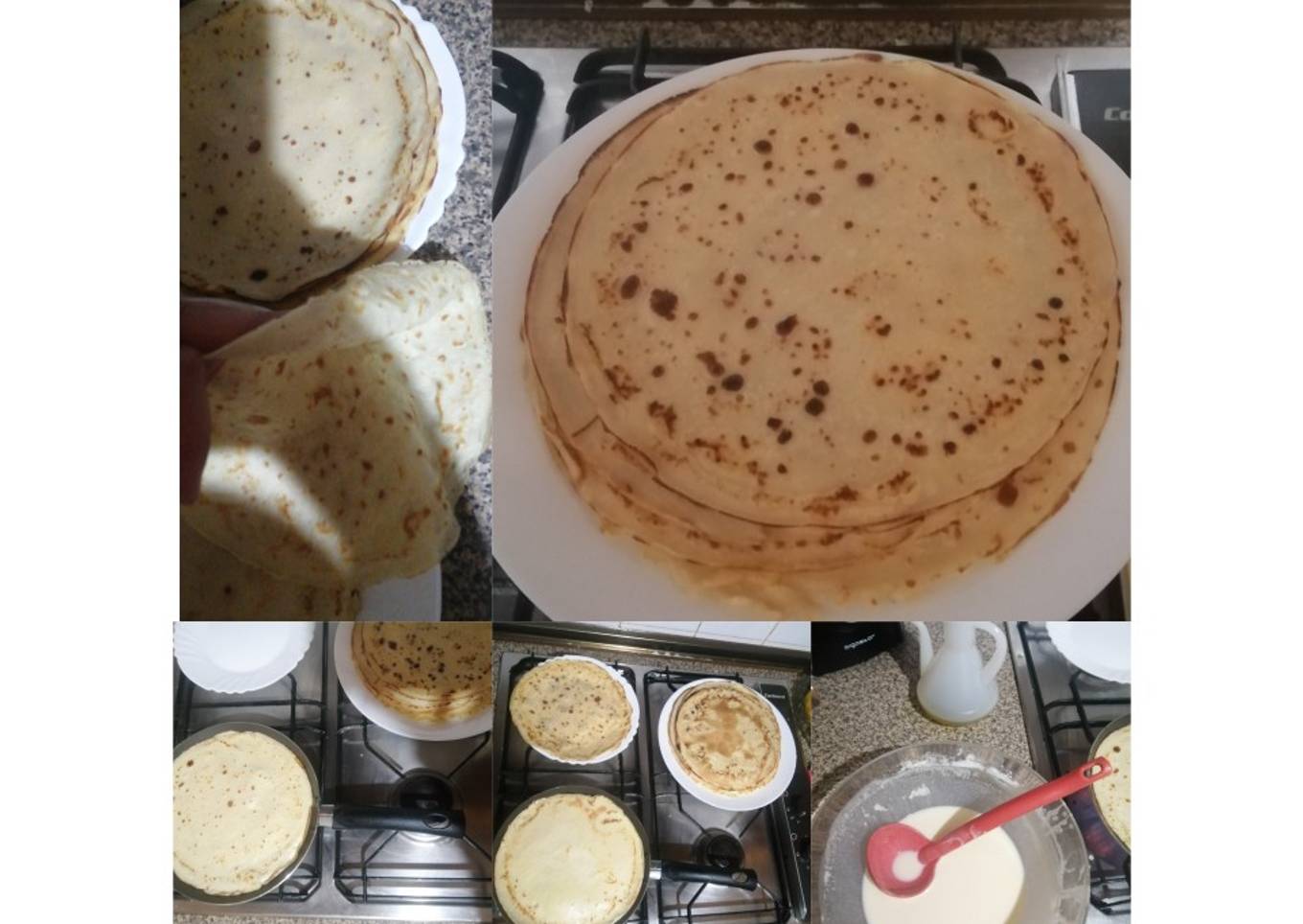 - Calentamos la sartén a fuego medio pincelamos con aceite y echamos un casillito de la mezcla lo dejamos un poco que se dore y cuando vemos que esta echo le damos la vuelta, depende si lo quieres más dorado o menos. Y así con todos, el grosor depende de lo que eches en la sartén.