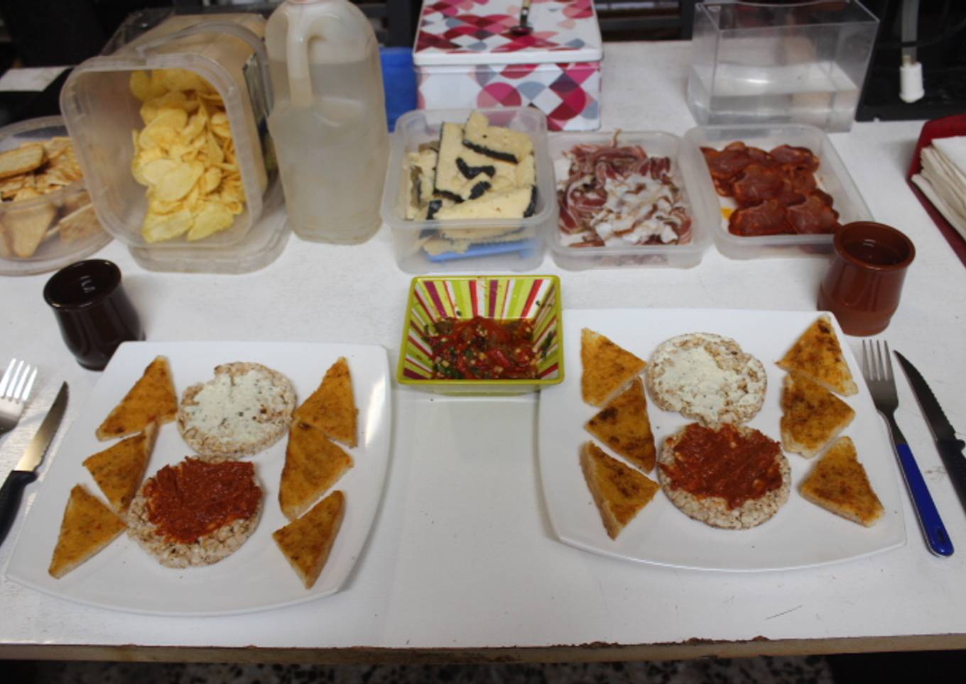 En esta ocasión hemos cenado como reyes, aprovechando sobras de unas tortitas de arroz y tres rebanadas de pan de molde que teníamos perdidas por casa, uniéndolas a unas sobras de ensalada de pimientos y berenjena y embutidos variados para acompañar el pan de molde untado de mi habitual salsa de tomate.